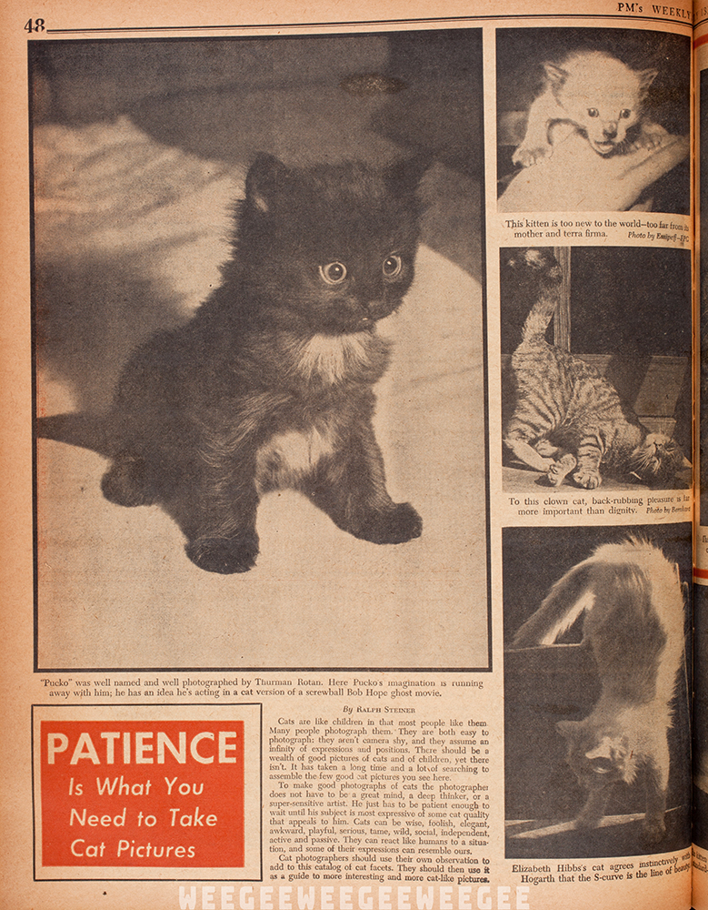 To make good photographs of cats the photographer does not have to be a great mind, a deep thinker, or a super-sensitive artist. He just has to be patient enough to wait until his subject is most expressive of some cat quality that appeals to him. Cats can be wise, foolish, elegant, awkward, playful, serious, tame, wild, social, independent, active and passive. They can react like humans to a situation, and some of their expressions can resemble ours.