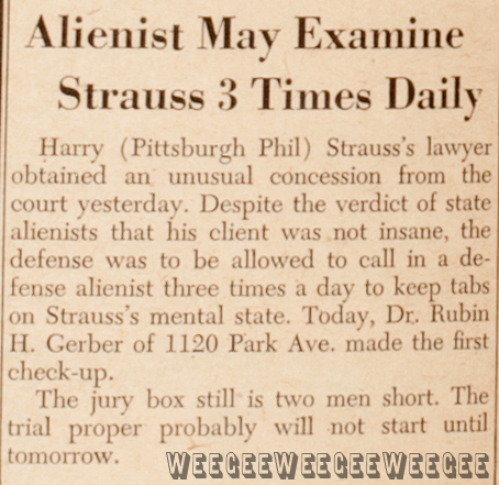 Harry (Pittsburgh Phil) Strauss’s lawyer obtained an unusual concession from the court yesterday. Despite the verdict of state alienists that his client was not insane…”