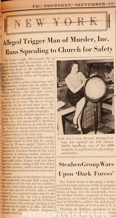 Shrieking hysterically that he was about to be killed, Vito Gurino, supposedly “toughest trigger man” of the Brooklyn murder ring exposed by District Attorney William O’Dwyer, sought sanctuary last night in the Roman Catholic Shrine of the Sea at Twenty-first Street and Tenth Avenue…