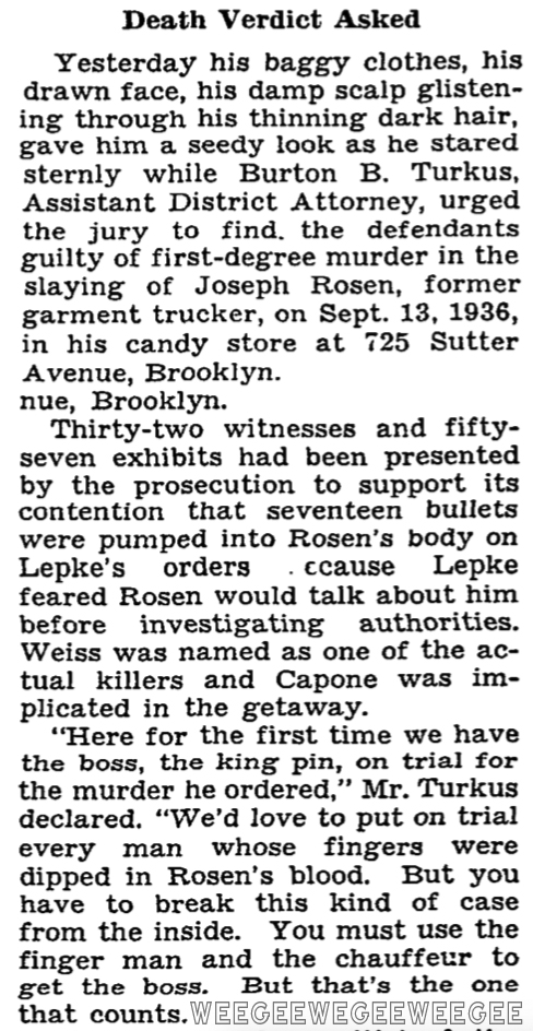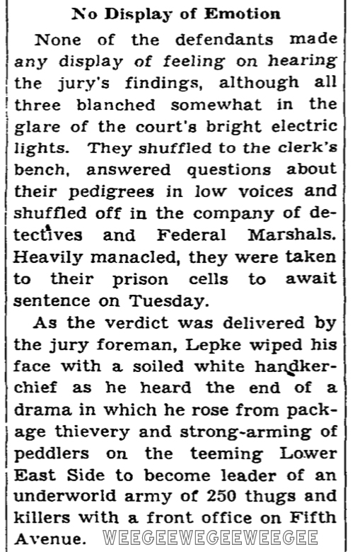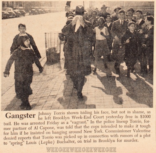 Gangster Johnny Torrio [1882-1957] shown hiding his face… Commissioner Valentine denied reports that Torrio was picked up in connection with rumors of a plot to “spring” Louis (Lepke) Buchalter, on trail in Brooklyn for murder.