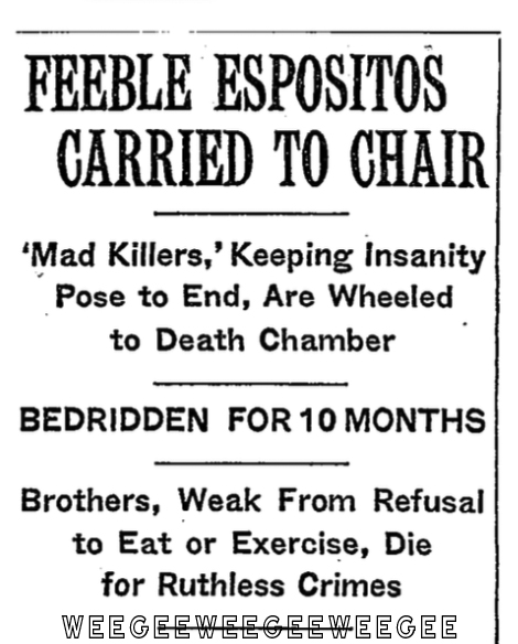 for Ruthless CrimesOSSINING, N.Y., March 12 – Apparently almost oblivious of their surroundings and what was being done to them, William and Anthony Esposito were put to death in the electric chair at Sing Sing Prison tonight for the murder of Patrolman Edward F. Maher, who was shot to death as he pursued the brothers after a hold-up in New York City on Jan. 14, 1941…