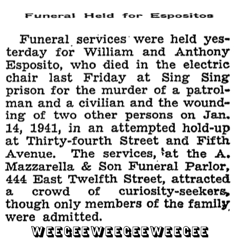 Funeral services were held yesterday for William and Anthony Esposito, who died in the electric chair last Friday at Sing Sing…