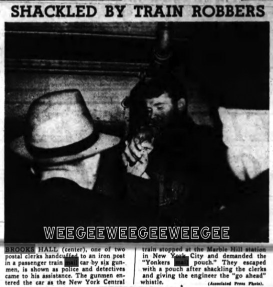 Brooks Hall (center) railway mail clerk on a New York Central train held up by six gunmen at the Marble Hill station in New York City, was shackled to an iron post in the mail car, along with his companion. The robbers escaped with a mail pouch which they apparently thought carried money shipments but which postal authorities said carried nothing of value.