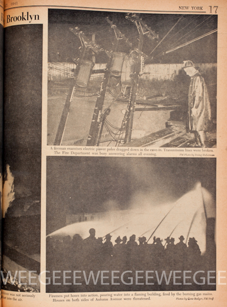 “Weegee Has a Salon: Arthur Fellig, the night-prowling cameraman who turns in many of PM’s choicest pictures of fires, wrecks, rescues and crimes, is having a one-man show of his own at the Photo League, 31 E. 21st St. The exhibit will run through Sept. 6.”