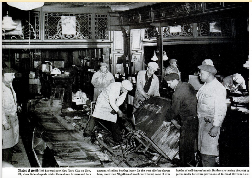 Shades of prohibition hovered over New York City on Nov. 23, when Federal agents raided three dozen taverns and bars accused of selling bootleg liquor. In the west side bar shown here, more than 50 gallons of hooch were found, some of it in bottles of well-known brands. Raiders are tearing the joint to pieces under forfeiture provisions of the Internal Revenue Service.