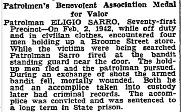 Patrolman ELIGIO SARRO, Seventy-first Precinct-On Feb. 2, 1942, while off duty and in civilian clothes, encountered four men holding up a Broome Street store. While the victims were being searched Patrolman Sarro fired at the bandit standing guard near the door. The holdup men fled and the patrolman pursued. During an exchange of shots the armed bandit fell, mortally wounded. Both he and an accomplice taken into custody later had criminal records. The accomplice was convicted and was sentenced to a long term in State prison.