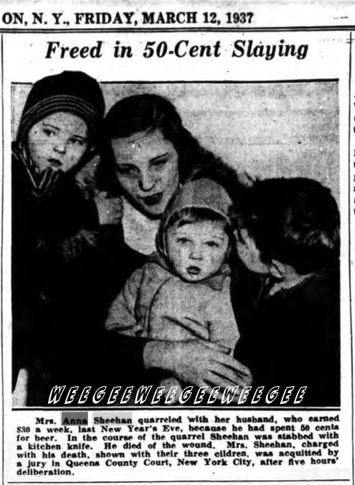 Mrs. Anna Sheehan, widow, left police headquarters, her eyes wet from a night of weeping, after being charged with the fatal stabbing of her husband, Joseph, aftermath of a New Year’s party.