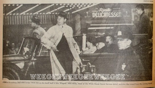 FDR at Broadway and 49th Street. With him on the back seat is Sen Wagner. Mike Reily, head of the White House Secret Service detail, watches the crowd from the running board. Photo by Weegee