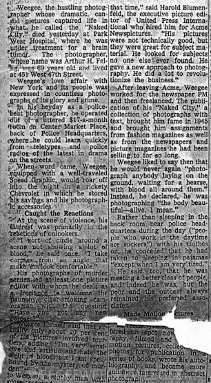 PHOTOGRAPHER DIES – Arthur Fellig, the famous photographer known as “Weegee,” who turned his experiences covering Manhattan police headquarters into the novel “Naked City”…