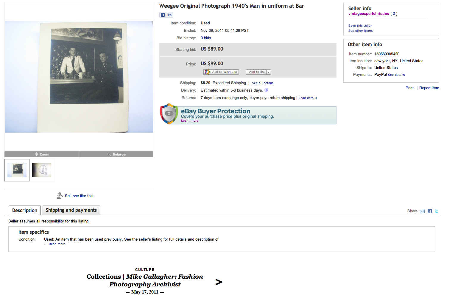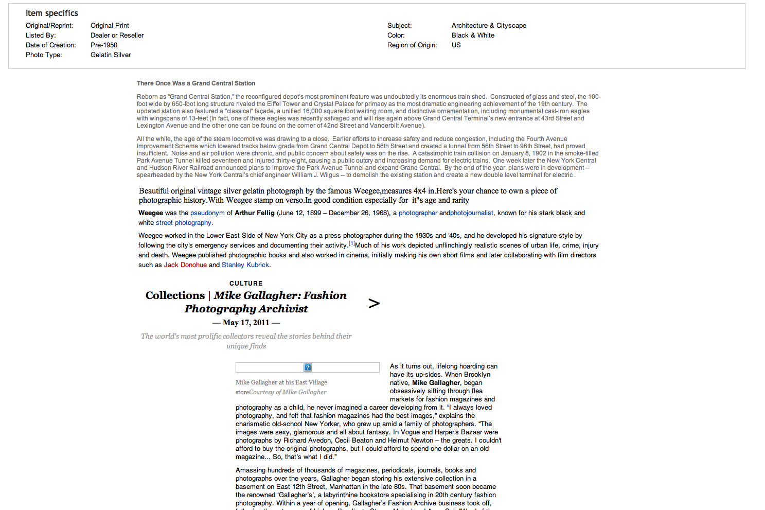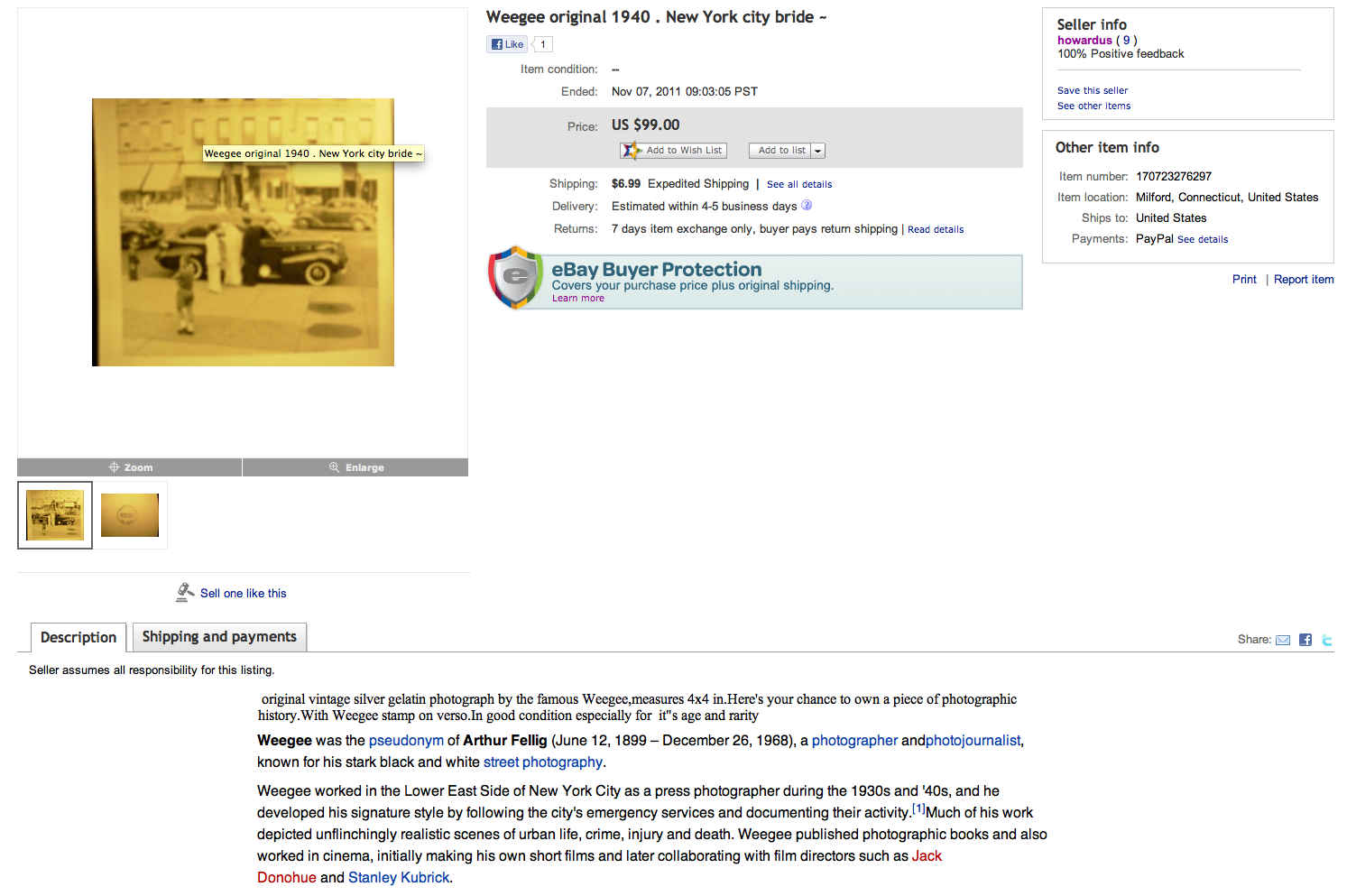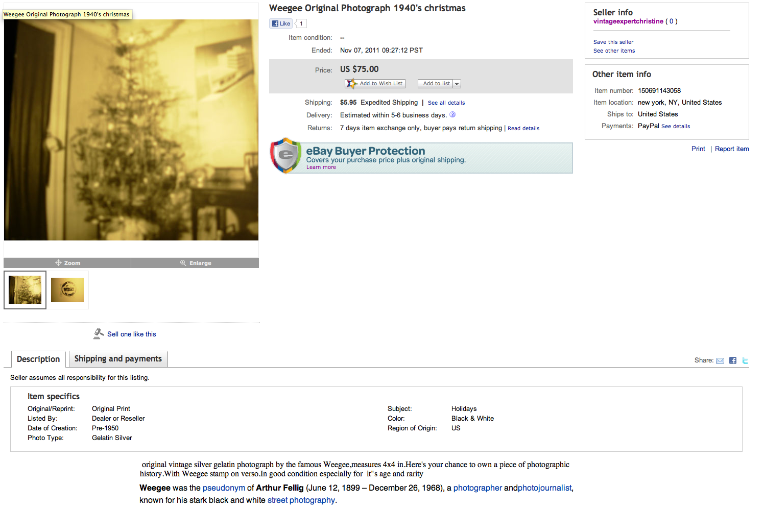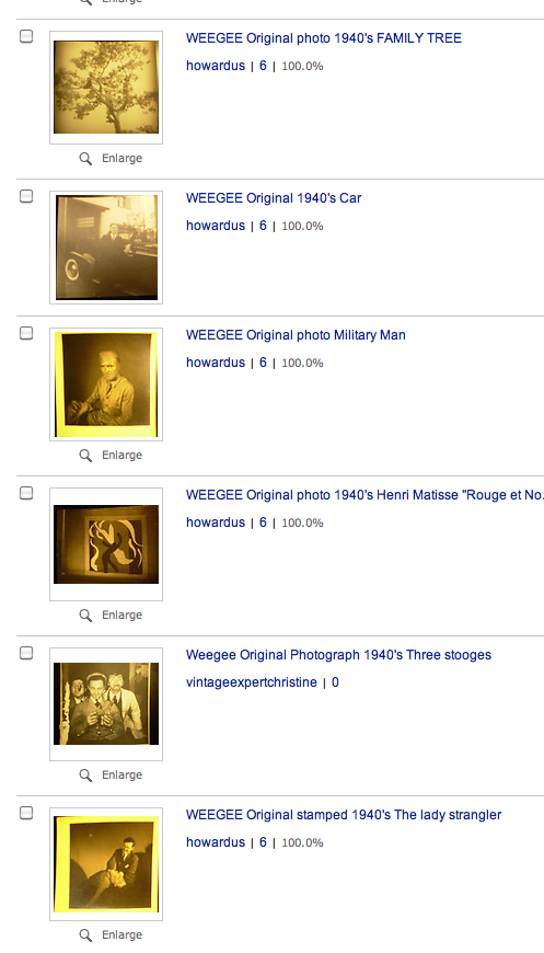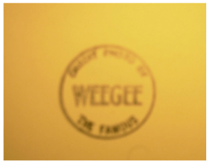“original vintage silver gelatin photograph by the famous Weegee,measures 4×4 in.Here’s your chance to own a piece of photographic history.With Weegee stamp on verso.In good condition especially for it”s age and rarity “
