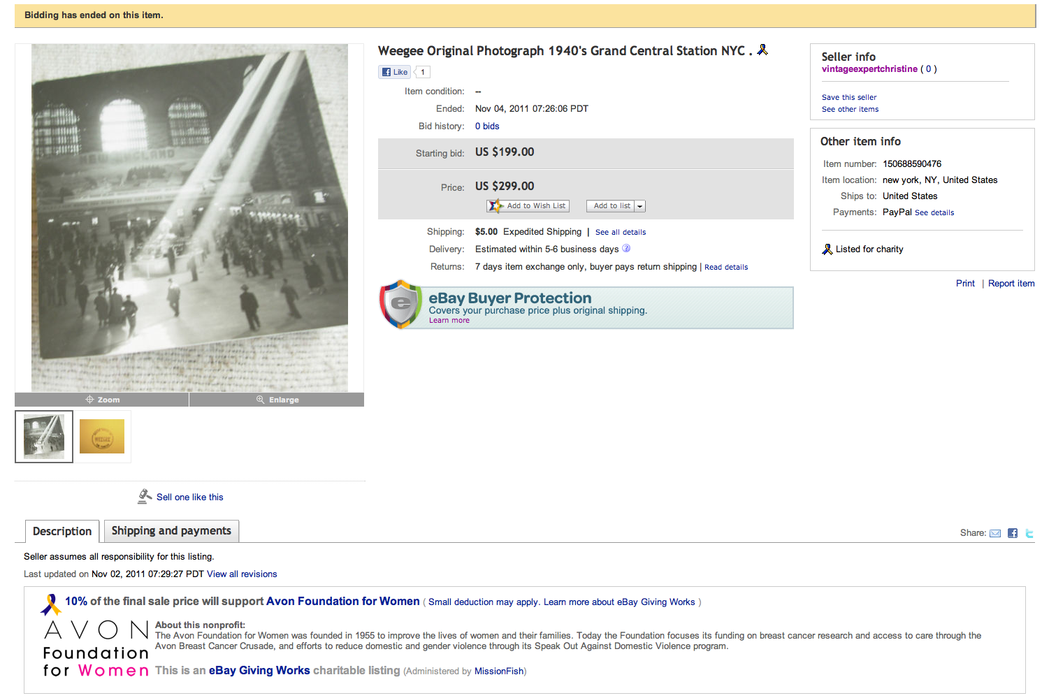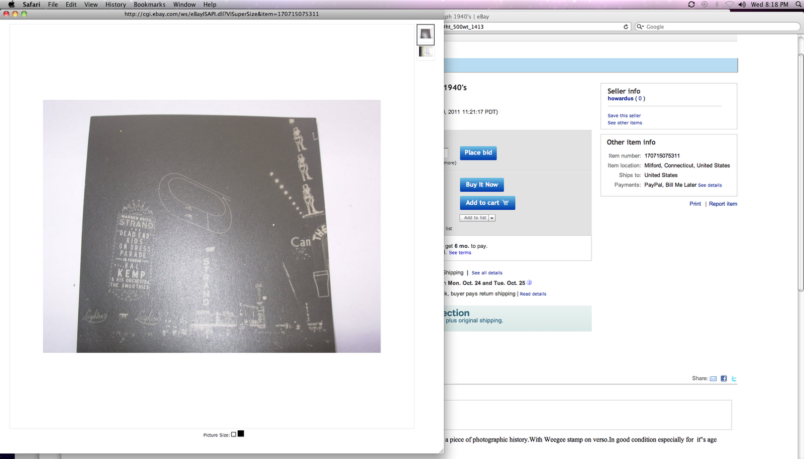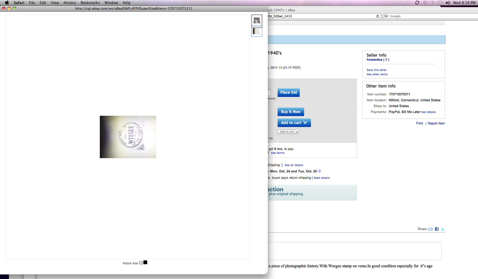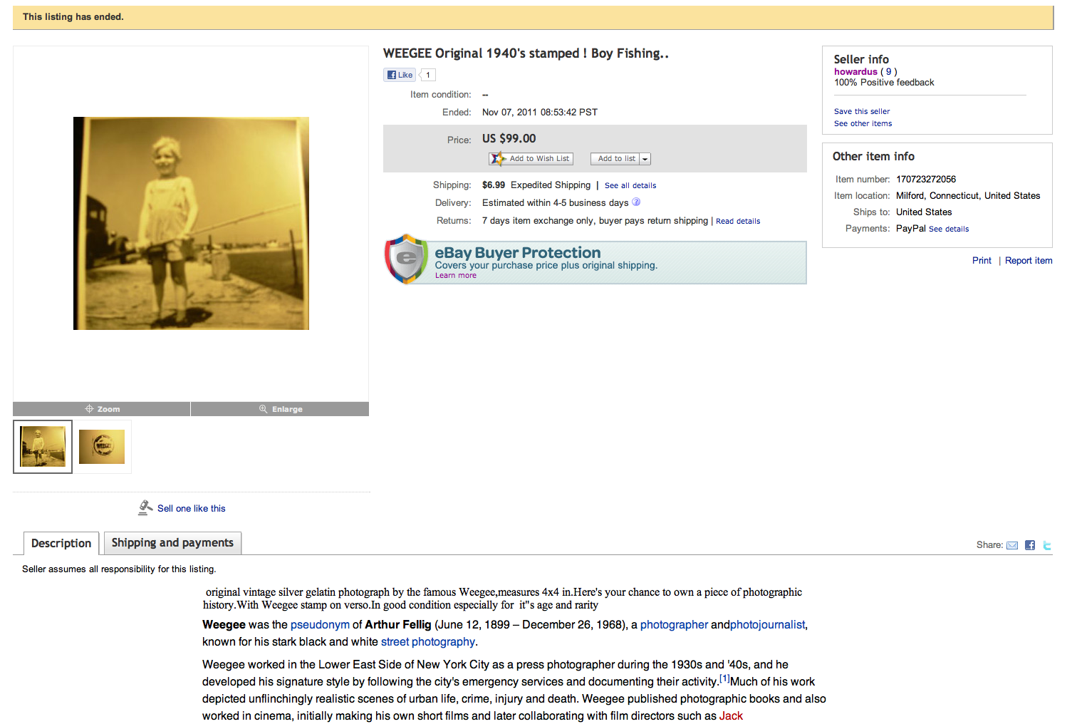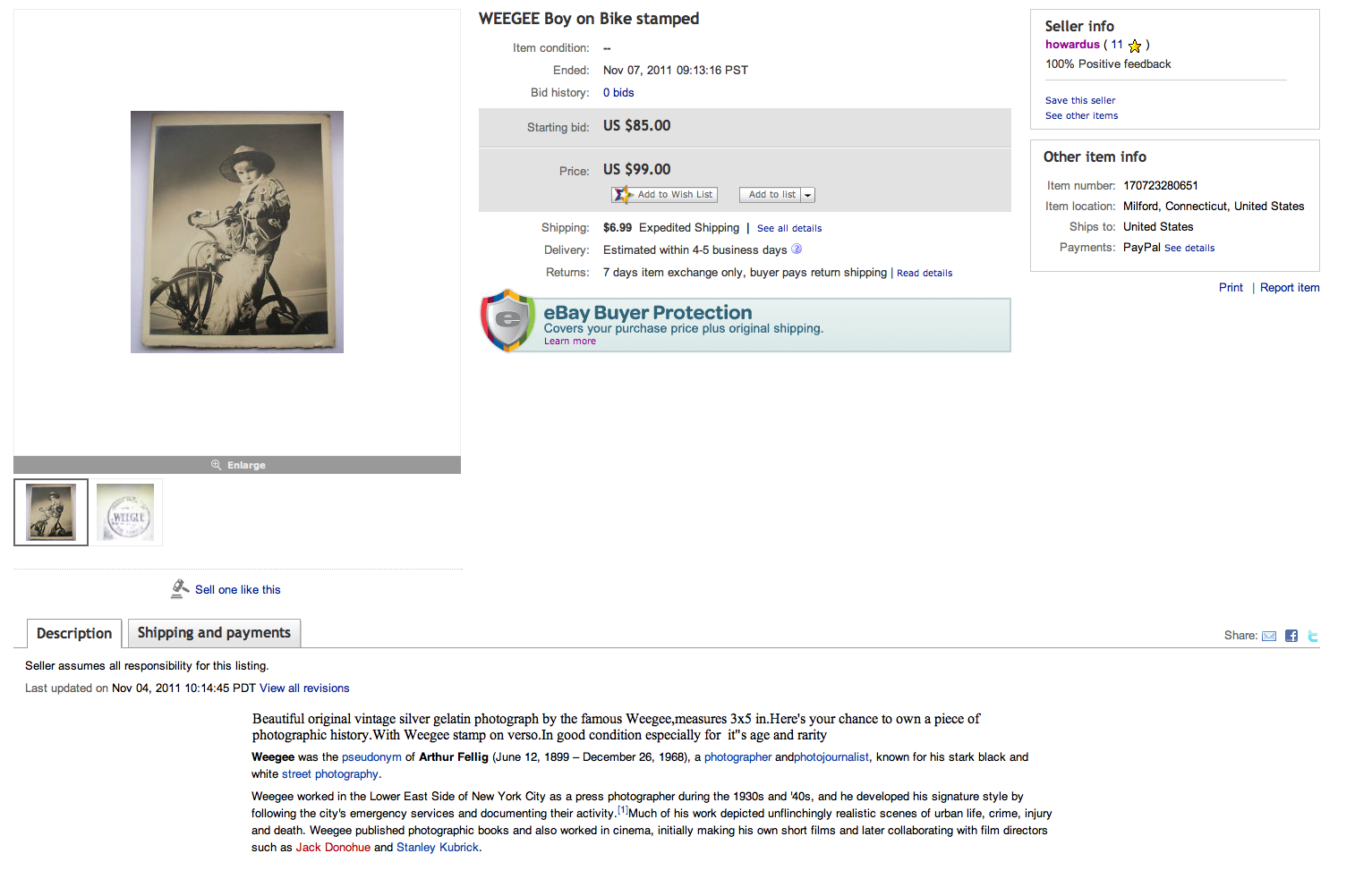 “original vintage silver gelatin photograph by the famous Weegee,measures 4×4 in.Here’s your chance to own a piece of photographic history.With Weegee stamp on verso.In good condition especially for it”s age and rarity “