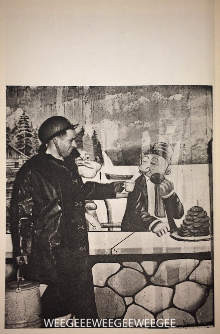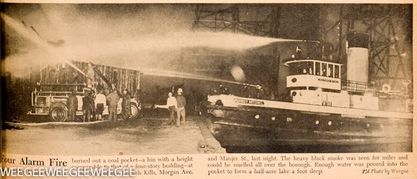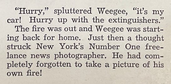 (It’s fascinating that while photographing the tragedy of a large fire at Coney Island, Weegee also made this funny foto of a coffee-toting fire-buff goofing around with Wimpy the hamburg-loving cartoon character and friend of Popeye. And that this is the photo that PM published of the fire…)