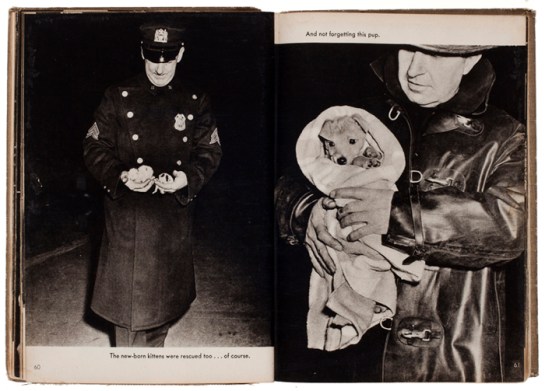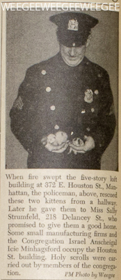 “When fire swept the five-story loft building at 372 E. Houston St., Manhattan, the policeman, above, rescued these two kittens from a hallway. Later he gave them to Miss Sally Strumfeld, 218 Delancey St., who promised to give them a good home. Some small manufacturing firms and the Congregation Israel Anscheigal Icie Minhagsford occupy the Houston St. building. Holy scrolls were carried out by members of the congregation.” PM Photo by Weegee