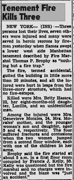 “Three persons died in a one-alarm fire at a tenement with out fire escapes at 239 W. 16th St. yesterday. Seven other persons were injured. On the street after the bodies were removed, Father G.J. Knoepfel, S.J., pronounced the last rites as ambulance doctor held his hat. Two of the dead were identified as Mrs. Betty Hasara, 22, and her daughter Lucille, 8 months. The other body was too badly burned for identification. Two men were rescued from ladders; two women carrying children jumped from second-floor windows. Police are investigating the fire, which apparently started on the first floor and swept through the roof. Flames were 40 feet high when firemen arrived. Other fires yesterday took two lives in Brooklyn.