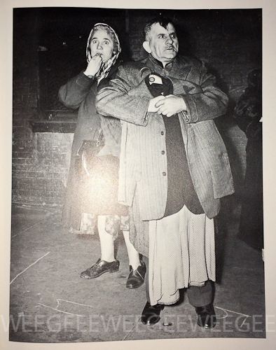 “A couple driven out from the burning tenement… I don’t know their names… but I did hear someone call him ‘Pincus’… so here they are right across the street from their burning tenement… it looks like Pincus had time to grab a woman’s dress… his best coat… but minus the pants…” Naked City, 1945, p. 71
