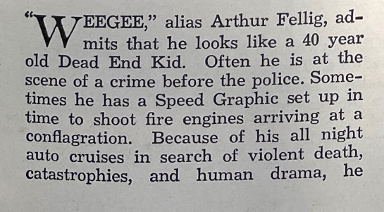 “Weegee,” alias Arthur Fellig, admits that he looks like a 40 year old Dead End Kid…