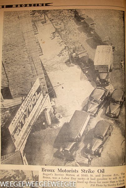 Bogart’s Service Station at 164th St. and Jerome Ave. he Bronx, was a Labor Day rarity – it had gasoline to sell. At 10 a.m. yesterday cars were lined up there for more than a block.”