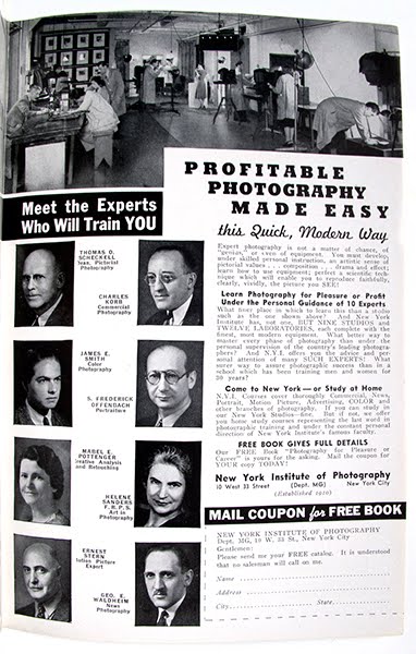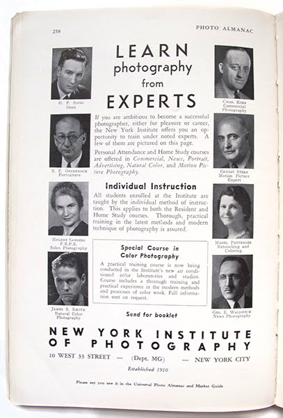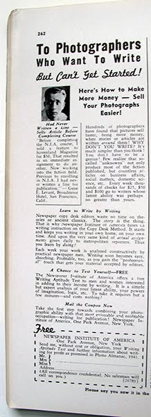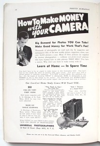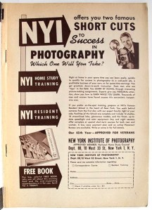 It’s 1940 and you want to be a photographer… You could learn from the experts at the New York Institute of Photography, 10 West 33 St., NYC, (established in 1910!)… If you want to “Make good money for work that’s fun!” you could write to Universal Photographers, also, coincidentally, located at 10 West 33 St., NYC… If you don’t want to wait 60 years for the ubiquity of MFA programs you could “take the first step towards combining your photographic ability with that most enjoyable and profitable occupation – writing for publication!” Perhaps the Newspaper Institute of America can help get you started… “Hundreds of photographers have found that pictures sell faster, bring more money, when stories or articles are written around them! WHY DON’T YOU WRITE? It’s simpler than you think! You don’t have to be a genius!” Photo Almanac 1940 and 1941