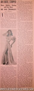 Thus, when exotic Sherry Britton chants a slightly naughty ditty, and drops with thorough finesse and little difficulty the bright scarlet satin gown and the interesting undergarments which lie beneath it, we are inclined to regard Miss Britton as a daring performer.
