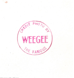(Of course which photos have a “Please Credit Weegee From Photo-Representatives” stamp is indicative of something. Presumably, only photos that Weegee had in his possession from around 1953 to 1959, or perhaps as late as the mid 60s, have a Photo-Representatives stamp, in black ink. These photos could have been made at any time. A photo, made and printed in the 30s or 40s could have a Photo-Representatives stamp. Perhaps at some point in the 1950s someone stamped all, or many, of Weegee’s photos with a Photo-Representatives stamp.)