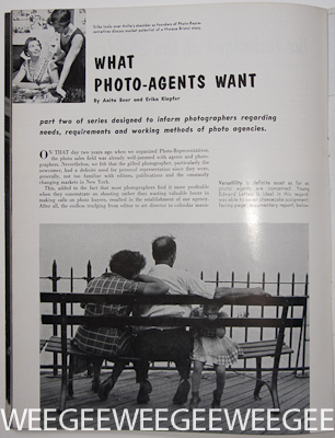 Photo-Representatives sells their “photographer’s work” and gets assignments for their photographers, researchers and discovers photo stories, does the billing and price setting, and “act as guides, critics, and friends in developing our photographers’ talent and direction.” Art Photography, 1956, p.30