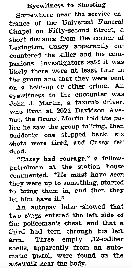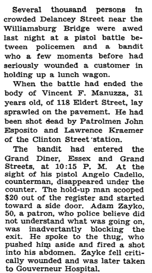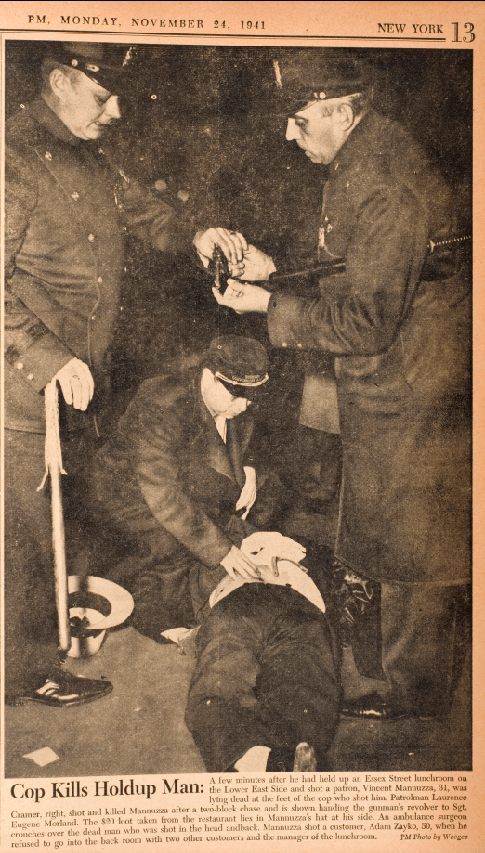 A few minutes after he held up an Essex Street lunchroom on the Lower East Side and shot a patron, Vincent Mannuzza, 31, was lying dead at the feet of the cop who shot him. Patrolman Laurence Cramer, right, shot and killed Mannuzza after a two-block chase and is shown handing the gunman’s revolver to Sgt. Eugene Morland. The $20 loot taken from the restaurant lies in Mannuzza’s hat at his side. An ambulance surgeon crouches over the dead man who was shot in the head and back. Mannuzza shot a customer, Adam Zayko, 50, when he refused to go into the back room with two other customers and the manager of the lunchroom.