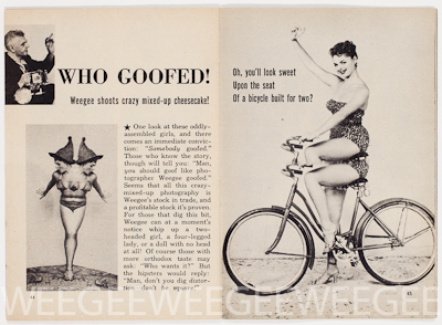 One look at these oddly assembled girls, and there comes an immediate conviction: ‘Somebody goofed.’ Those who know the story though will tell you: ‘Man, you should goof like photographer Weegee goofed.’ Seems that all this crazy-mixed up photography is Weegee’s stock in trade, and a profitable stock it’s proven. For those that dig this bit, Weegee can at a moment’s notice whip up a two-headed girl, a four-legged lady, or a doll with no head at all! Of course those with more orthodox taste may ask: ‘Who wants it?’ But the hipsters would reply: ‘Man, don’t you dig distortion – don’t be square!‘”