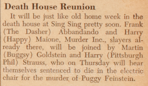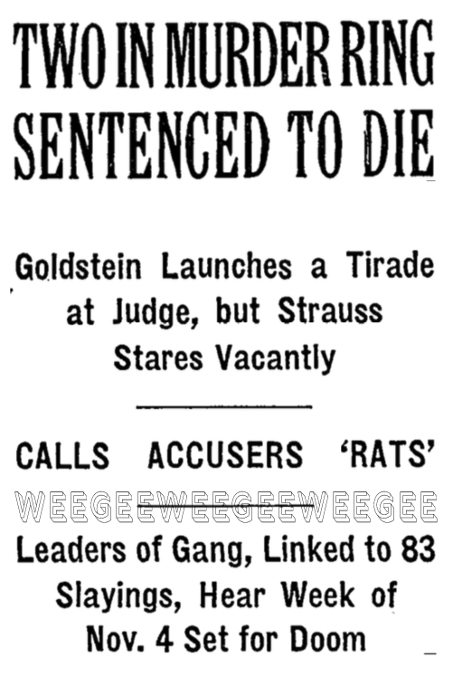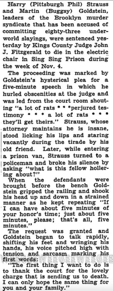 Both were sentenced to die the week of November 4th by Brooklyn County Judge John J. Fitzgerald, for the “contract” slaying of Irving (Puggy) Feinstein on Labor Day in 1939. They were convicted six days ago.