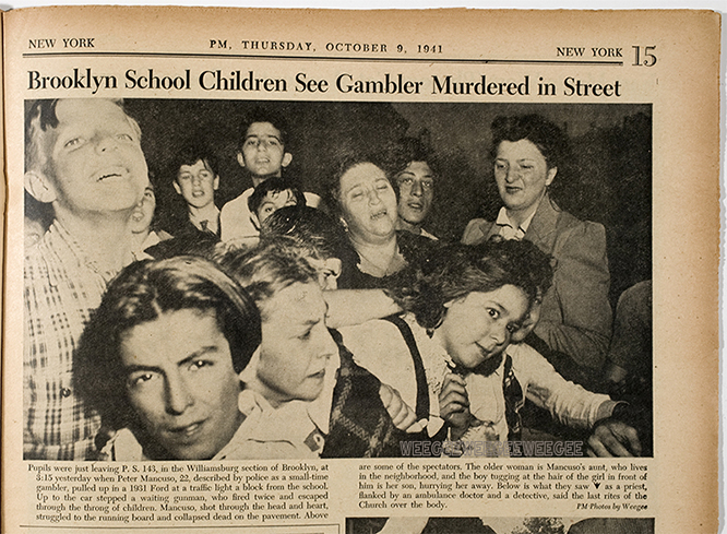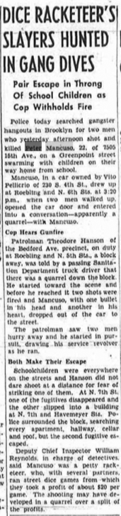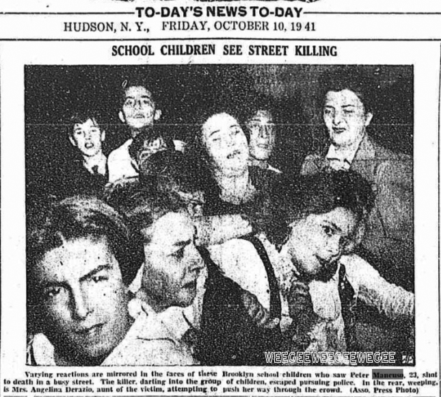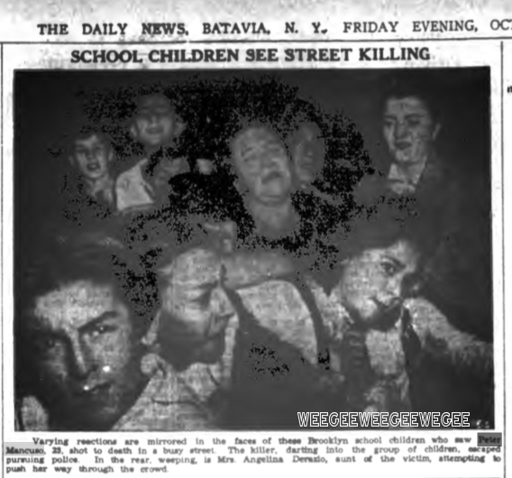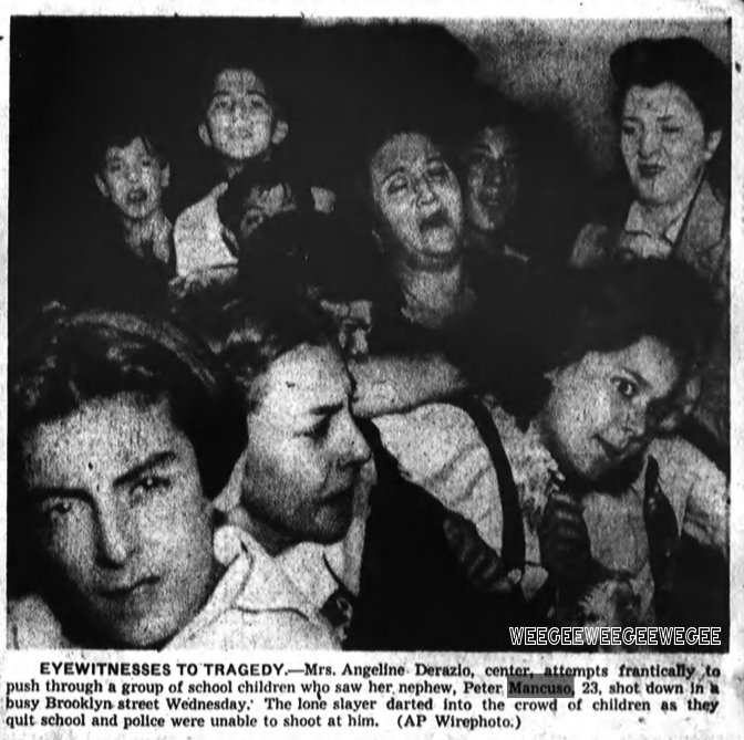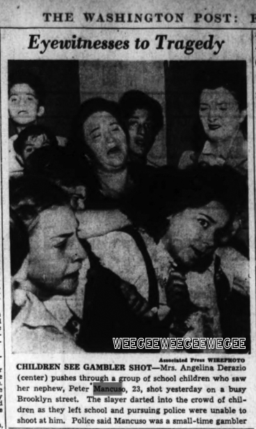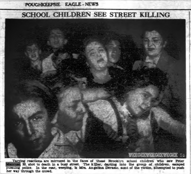 Pupils were just leaving P.S. 143, in the Williamsburg section of Brooklyn, at 3:15 yesterday when Peter Mancuso, 22, described by police as a small-time gambler, pulled up in a 1931 Ford at a traffic light a block from the school. Up to the car stepped a gunman, who fired twice and escaped through the throng of children. Mancuso, shot through the head and the heart, struggled to the running board and collapsed dead on the pavement. Above are some of the spectators…