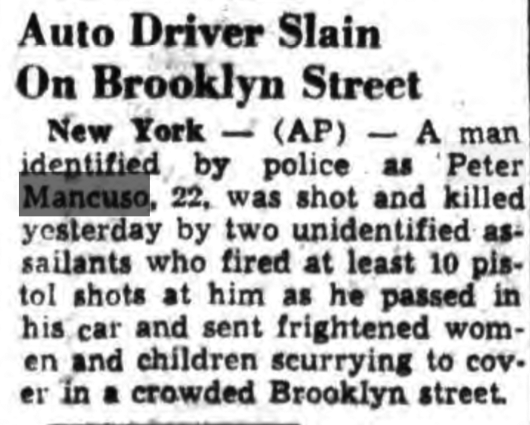 One bullet hit Mancuso in the head, another in the heart. With a dying effort he got the door of the car open and toppled into the street…