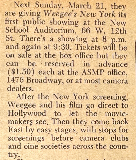 …Among films to be presented are… Weegee’s first [film] Weegee’s New York.
