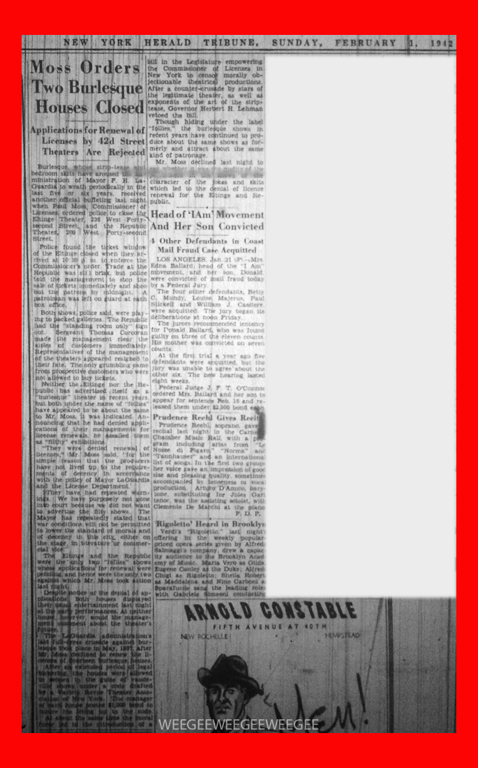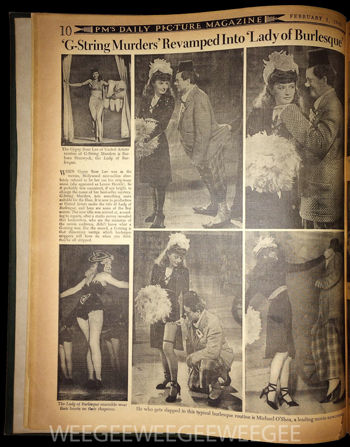 WHEN Gypsy Rose Lee was in the movies, Hollywood nice-nellies absolutely refused to let her use her strip-teasy name (she appeared as Louise Hovick). So it probably was consistent, if not bright, to change the name of best-seller mystery, G-String Murders, into something more suitable for the films. It is mow in production at United Artists under the title or Lady of Burlesque, and here are some or the first scenes. The new title was arrived at, according to reports, after a studio survey revealed that housewives, who are the mainstay of the movie audience, didn’t know what a G-string was. For the record, a G-string is that rhinestone vestige which burlesque strippers still have on when you think they’re all stripped.”