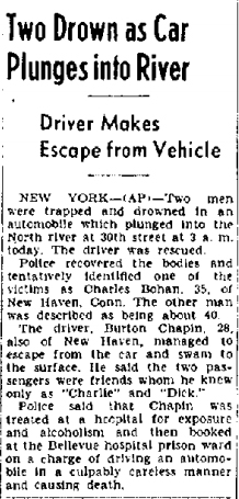 PM Daily, January 25, 1942, Vol. 2, No. 32, p. 11 Two Passengers Are Killed As Auto Dives Into Hudson Police Raise Connecticut Auto that plunged into the Hudson at 29th St. Saturday. Two people (one in car window) were killed…