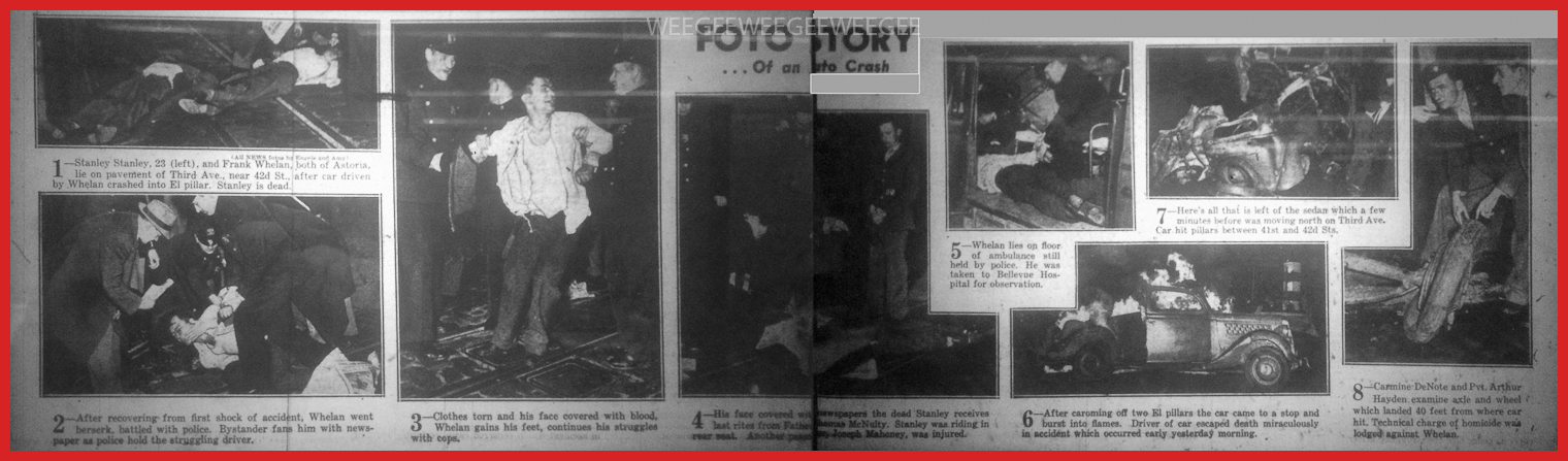 PM Daily, January 2, 1942, Auto Crashes marred New Year-as usual. When this car struck El pillar at 48th At. and Third Ave. driver was injured.
