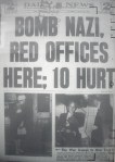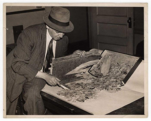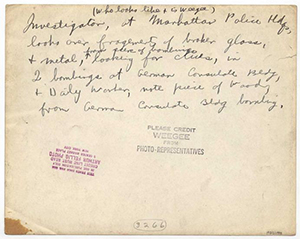 Weegee, Investigator, (who looks like & is Weegee) at Manhattan Police Hdqs, looks over fragments of broken glass, & metal from scene of bombings, for clues, in 2 bombings at German Consulate Bldg, & Daily Worker, note piece of wood, from German Consulate Bldg bombing, June 1940