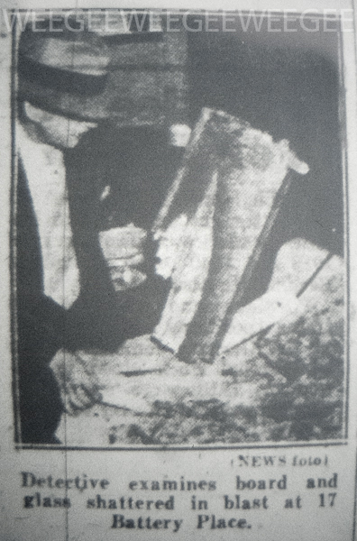 Weegee or Unidentified Photographer, Detective examines board and glass shattered in blast at 17 Battery Place, June 22, 1940