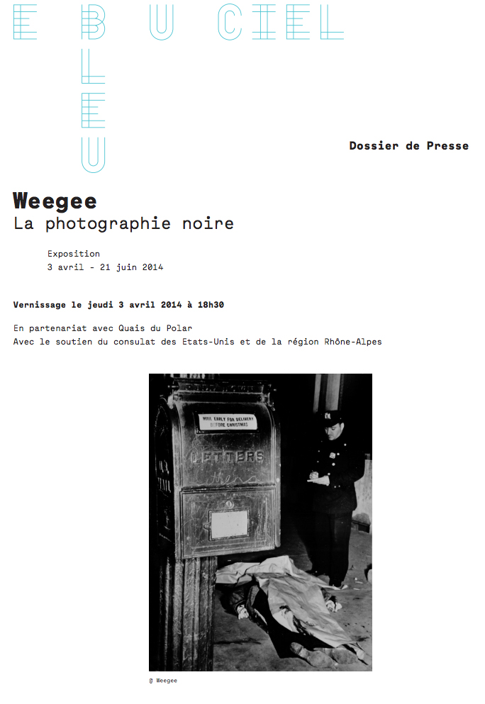 “Weegee the Famous. Black photography” on gallery Blue sky, 12, rue des Whimsical, Lyon 1. Tel. : 04-72-07-84-31. Until June 21