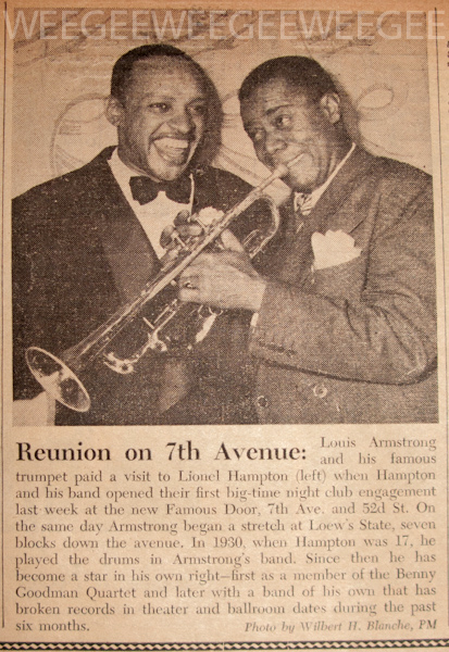 November 2, 1943 November 2, 20131943 PM Daily, November 2, 1943, photo by Wilbert H. Blanche “Louis Armstrong and his famous trumpet paid a visit to Lionel Hampton…”