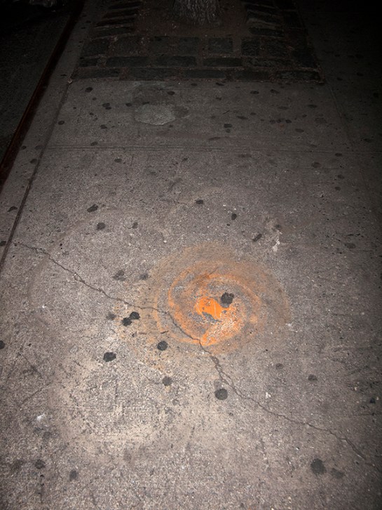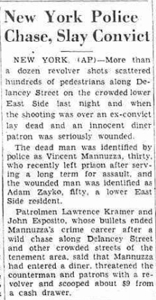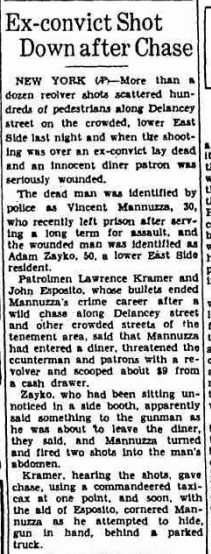 Cop Kills Holdup Man: A few minutes after he had held up an Essex Street lunchroom on the Lower East Side and shot a patron, Vincent Mannuzza, 31, was lying dead at the feet of the cop who shot him. Patrolman Laurence Cramer, right, shot and killed Mannuzza, after a two-block chase and is shown handing the gunman’s revolver to Sgt. Eugene Morland. The $20 loot taken from the restaurant lies in Mannuzza’s hat at his side. An ambulance surgeon crouches over the dead man who was shot in he head and back. Mannuzza shot a customer, Adam Zayko, 50, when he refused to go into the back room with two other customers and the mangaer of the lunchroom.
