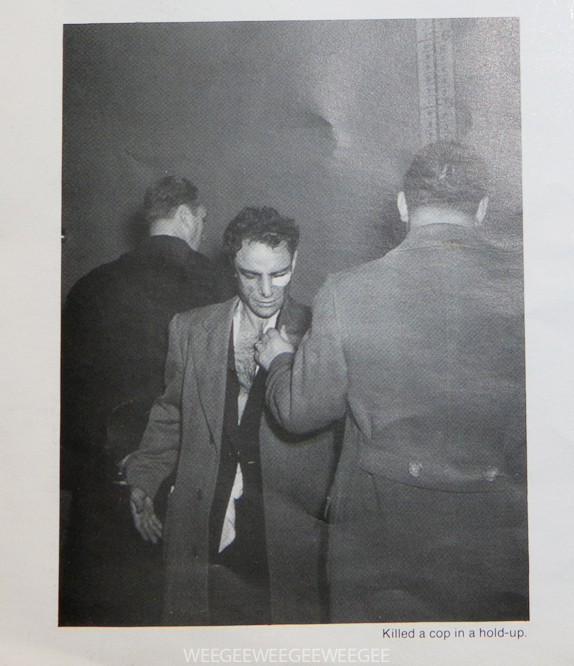 Weegee the Famous, 1977, p. 77. (Booked on suspicion of killing a policeman, 1939)