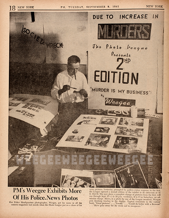 MORE MURDER PIX, also fires, accidents and freak shots were demanded by visitors, therefore Arthur (Weegee) Fellig, as shown…, hangs out the sign for a second edition of his fascinating exhibition at the photo League, 31 E. 21st St.