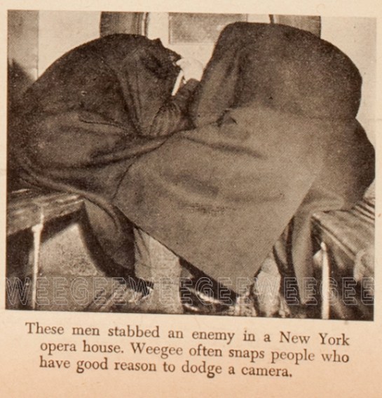 These men stabbed an enemy in a New York opera house. Weegee often snaps people who have good reason to dodge a camera.