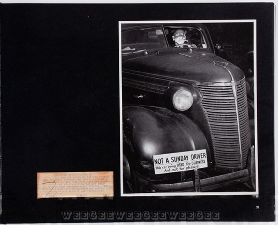 New York – The envious looks of gasless former “Sunday Drivers” pierced the tender epidermis of “Weegee” noted New York freelance photographer as he toured the city while on the job today. To get rid of that uncomfortable feeling, “Weegee” mounted this explanation of gasoline expenditure on the front of his machine and immediately felt much better.